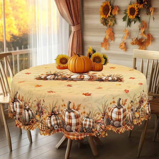 1 Piece Thanksgiving Round and Rectangular Tablecloth, Various Sizes, Autum Pumpkin Wheat Ear Orange Plaid Tablecloth, Table Cover for Home Kitchen, Terrace, Gift