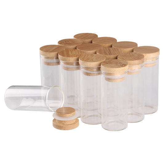 12pcs/lot 10ml 15ml 20ml 25ml 30ml 40ml 45ml 50ml 60ml Glass Empty Bottles With Bamboo Caps Spice Jars Glass Vessels DIY Crafts