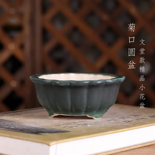 Round Glazed Bonsai Pot, Chinese Chrysanthemum Shape, Colorful, Green, Dormitory Table,Room and Garden Decoration