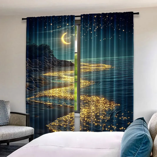 2Pcs Beach Moonlight Curtain Ocean Coastal Sea Waves Starry Night Sky Scenery Fantasy Teal