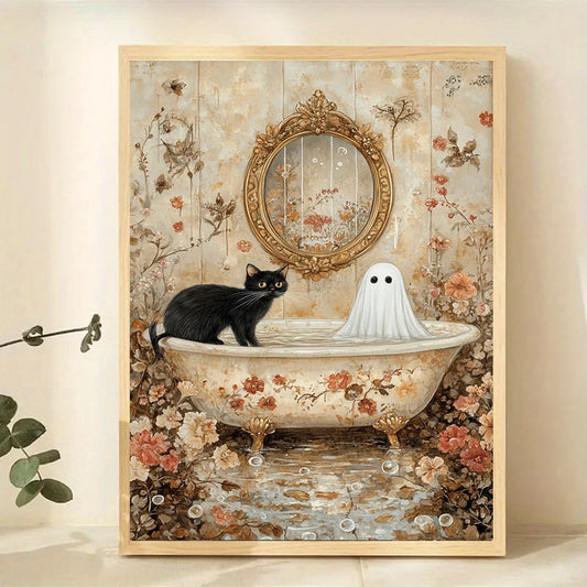 No Framed, Creepy Halloween Bathroom Print,Ghost with a Black Cat in the Bathtub ,Funny Halloween Decor,Cute Ghost Art, Vintage