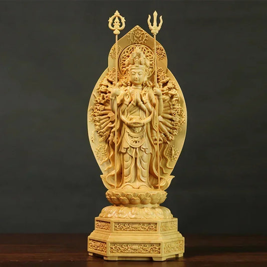 High Quality 20cm Boxwood Thousand-Hand Guanyin Carving Sculpture Home Decor