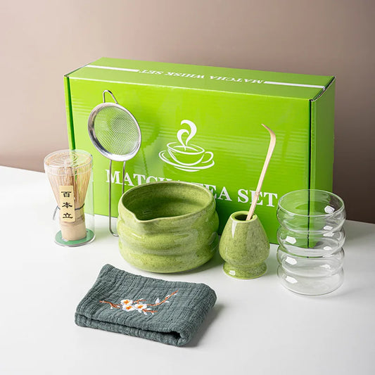 8pcs Japanese Matcha Tea Set – Ceramic Bowl, Bamboo Whisk, Scoop & Sifter – Traditional Matcha Ceremony Kit | NaturalBuiltHome