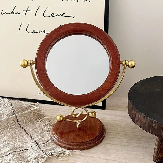 Makeup Mirror Desktop Retro Solid Wood Decoration Ornament Dormitory Desk Desktop Vanity Mirror Rotating Round Mirror