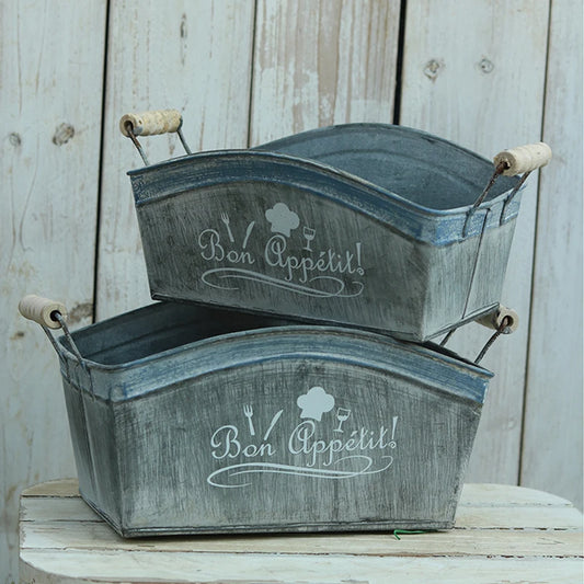 Retro Iron Tray With Wooden Handles Vintage Metal Basket English Printing Organizer Plants Flower Pots Decoration Storage Trays