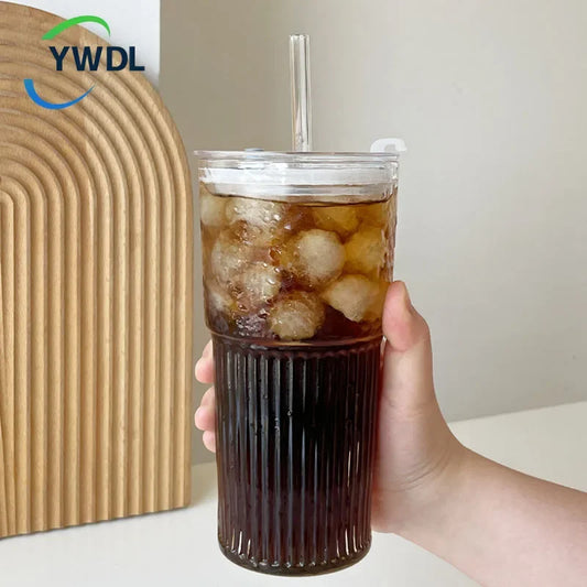 600ml Stripe Glass Cup with Lid And Straw Transparent Milk Tea Juice Cup Drinking Glasses Ice Water Coffee Mug Bar Drinkware
