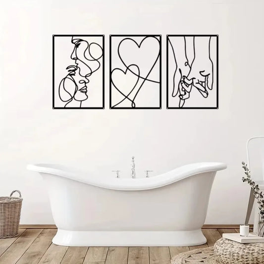 3-Piece Romantic Metal Wall Art Set: Minimalist Couple Silhouettes, Love & Kiss Line Drawings.