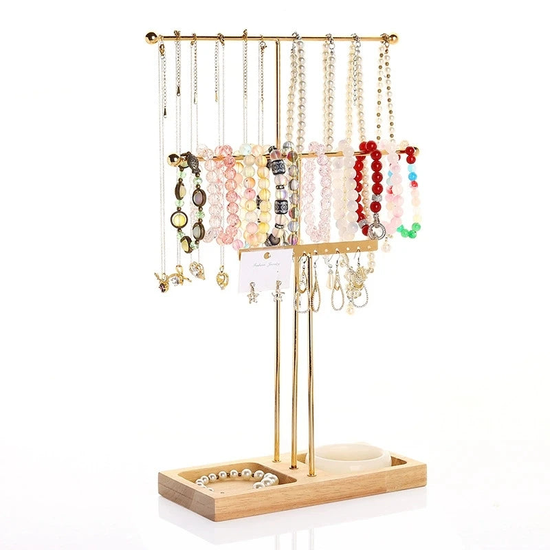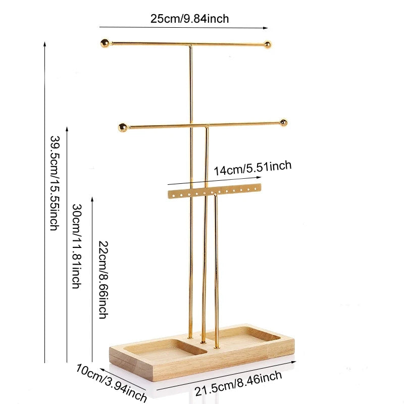 Display and organize your favorite jewelry in style with this 3-layer T-shaped metal jewelry stand. Featuring a solid wooden base and removable bars, it’s the perfect way to keep your necklaces, bracelets, and earrings neatly arranged while adding a modern decorative touch to your room.