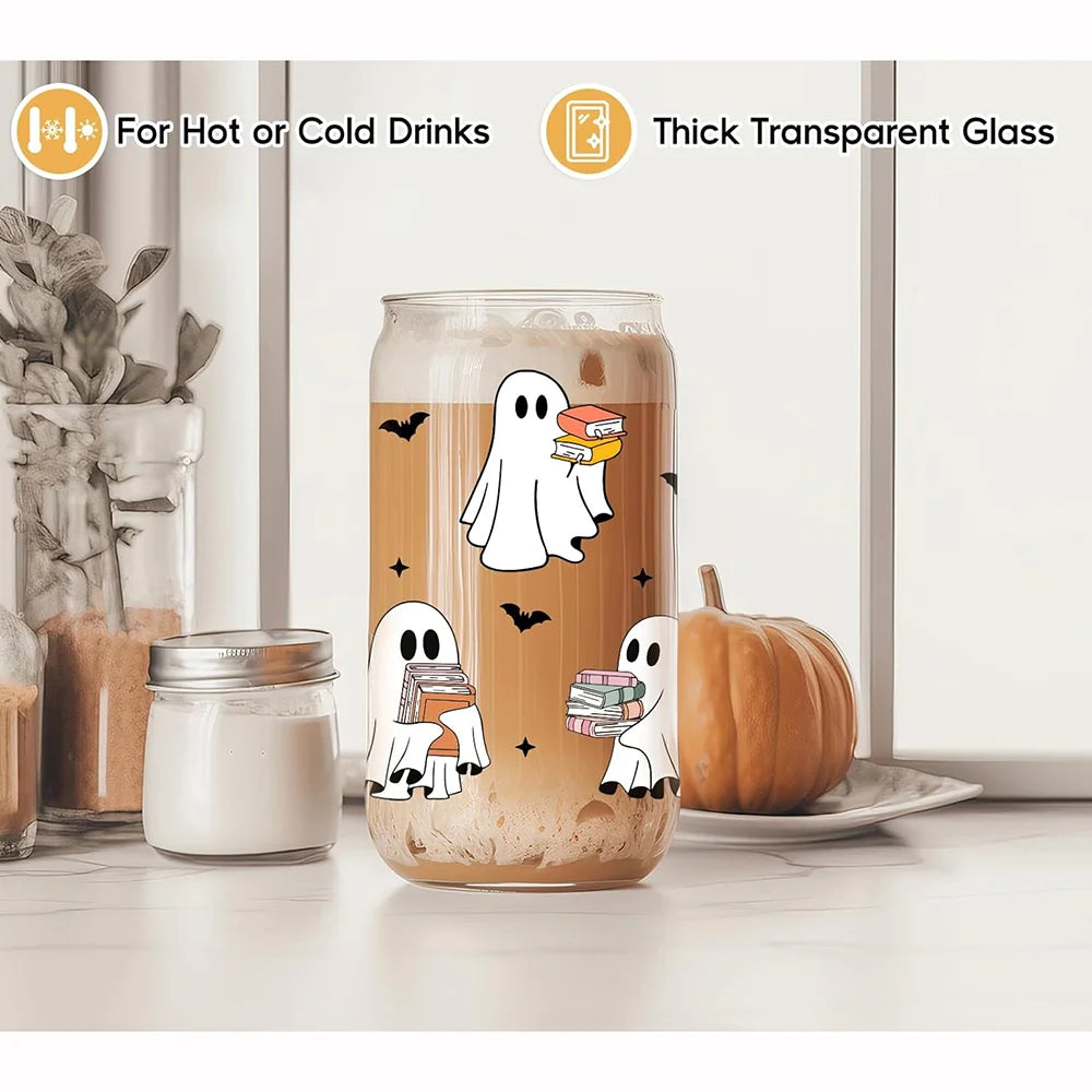 1Pcs Cute Ghost Water Cup Halloween Gift for Book Lovers Iced Coffee Tumbler Cup W/Lid Straw Table Accessories Librarian Gift