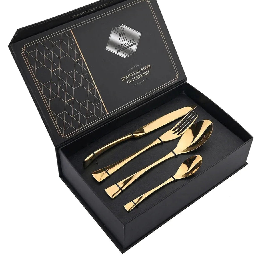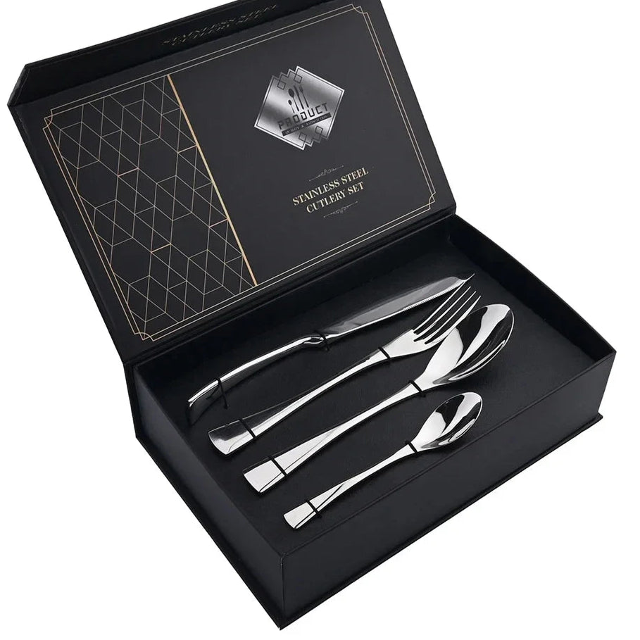 Bring elegance to your dining table with this 24-piece stainless steel cutlery set, designed with a mirror-polished finish and available in silver, gold, or black. Perfect for family meals, weddings, or as a refined gift box set.