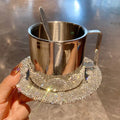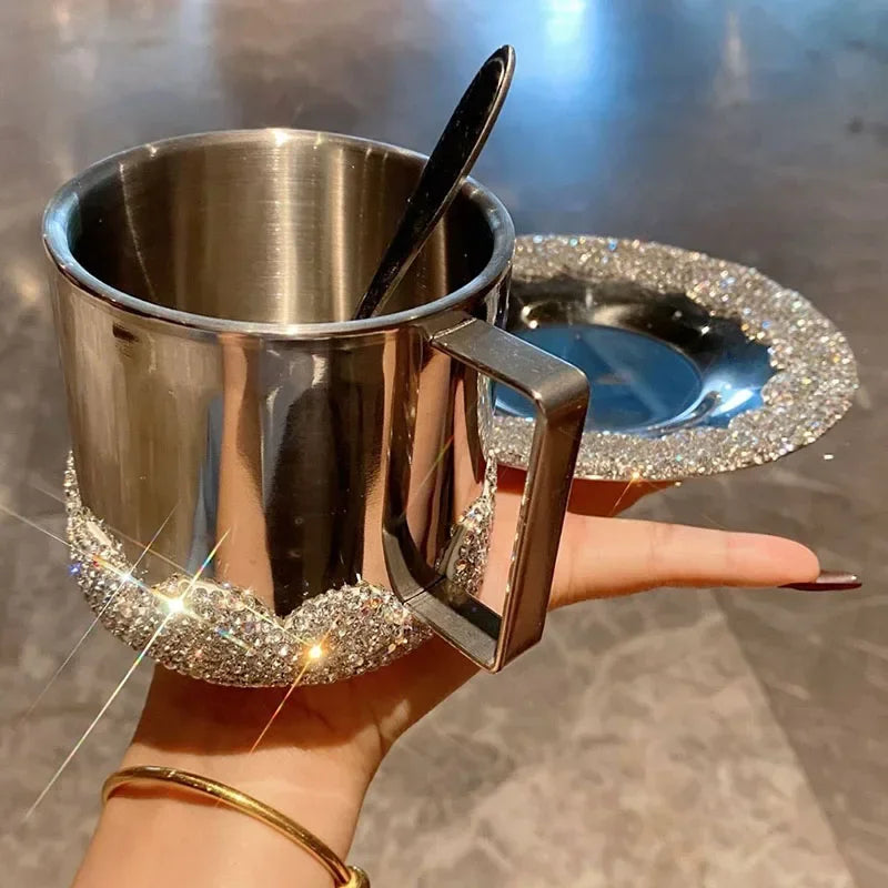 280ml 3pcs Coffee Cup Set Bling Rhinestone Stainless Steel Mug With Spoon Tea Cup Breakfast Milk Cup Saucer Office Home Mug Gift