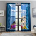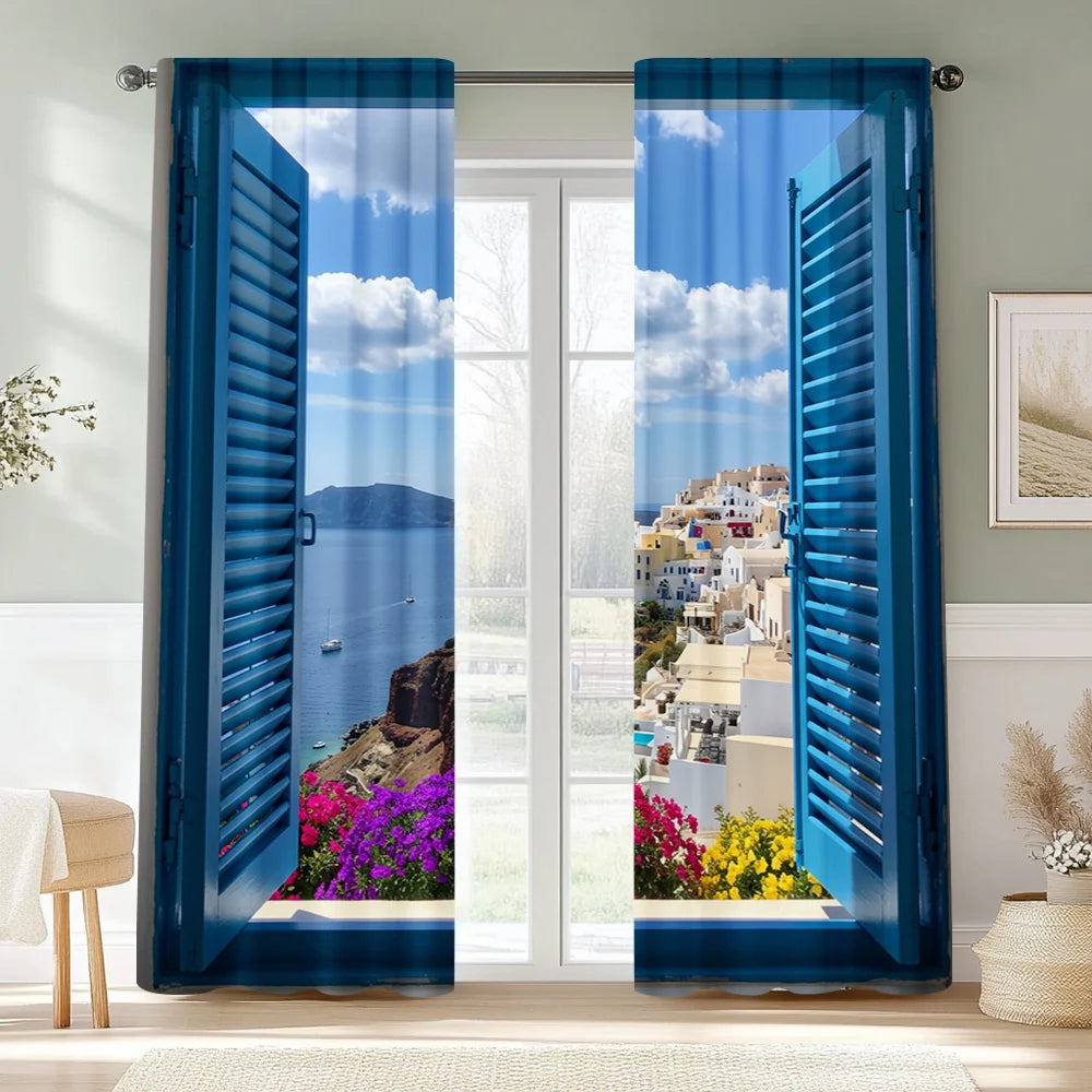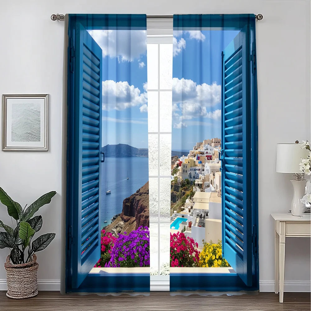 2pc, Party Window Curtains Aegean traditional architecture flowers window landscape 100% Polyester,Without Electricity Versatile