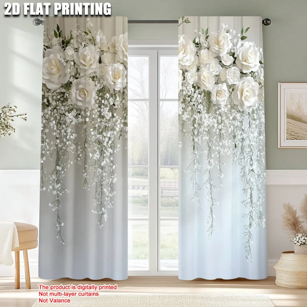 2pcs, Popular Curtains 2D print Elegant White Flowers Polyester Easy Install (without rod) Room Decor Perfect for Bedroom,