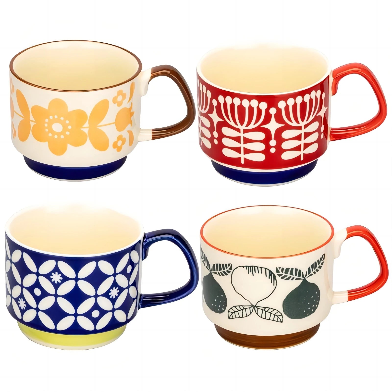 4pcs set Ceramic Ear Hanging Coffee Mug Underglaze Colored Breakfast Milk Oatmeal Cup Japanese Retro Style Lovers Mug Stackable