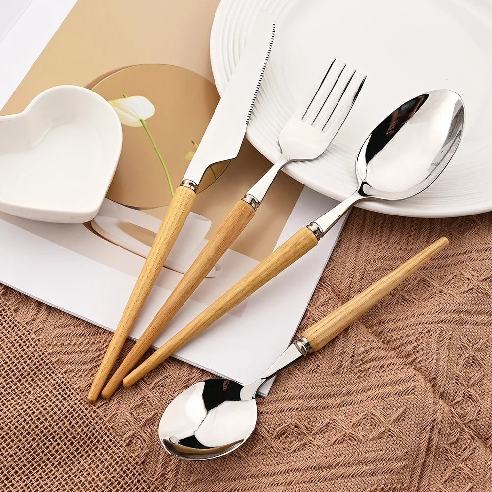 Upgrade your dining table with this elegant and practical wooden handle cutlery set.