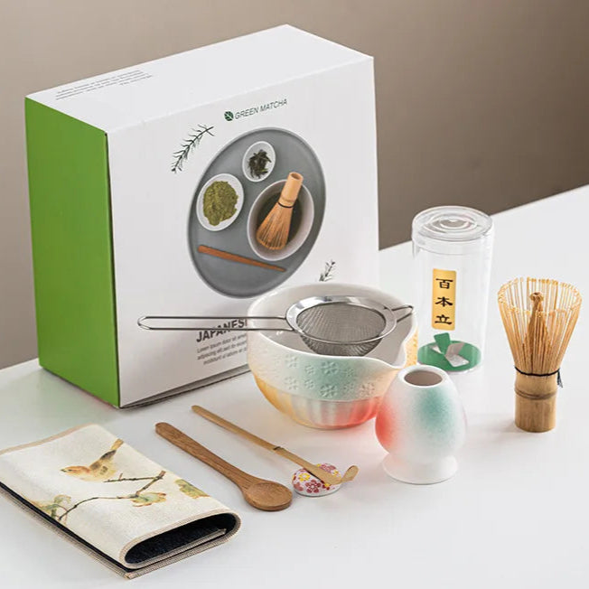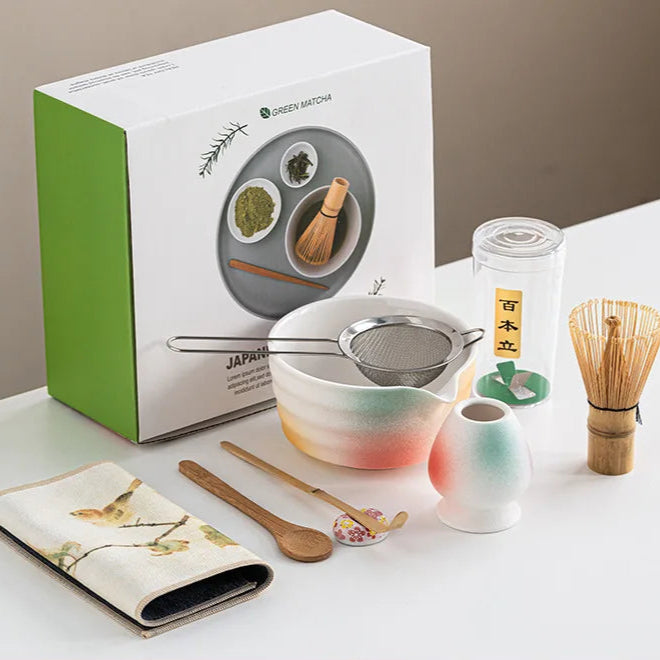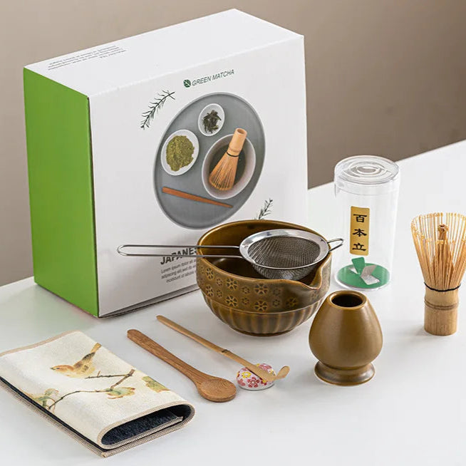 8pcs Japanese Matcha Tea Set – Ceramic Bowl, Bamboo Whisk, Scoop & Sifter – Traditional Matcha Ceremony Kit | NaturalBuiltHome