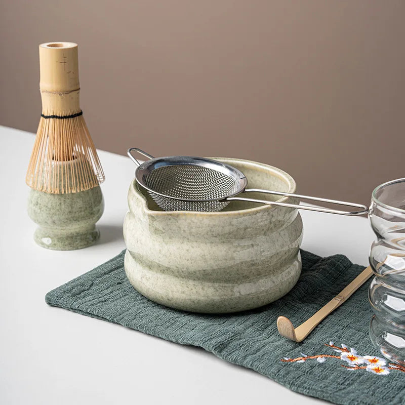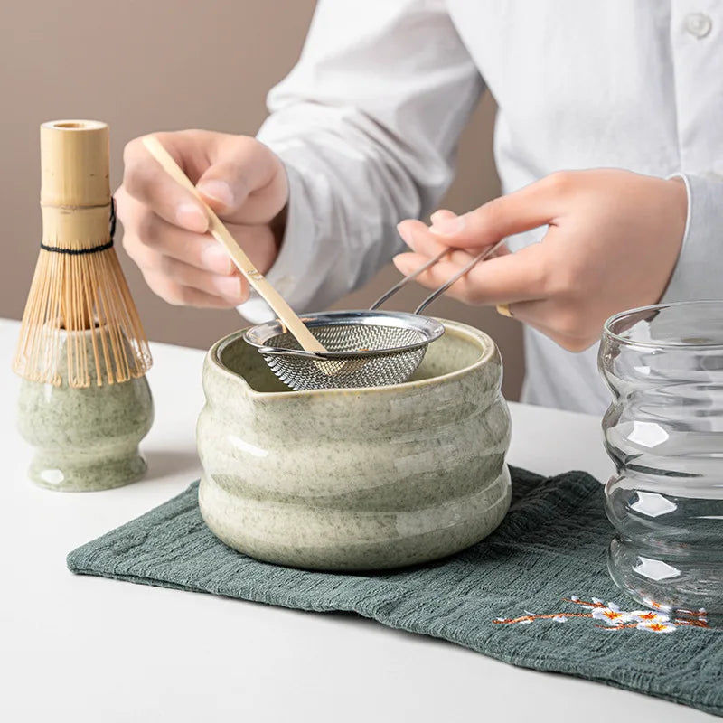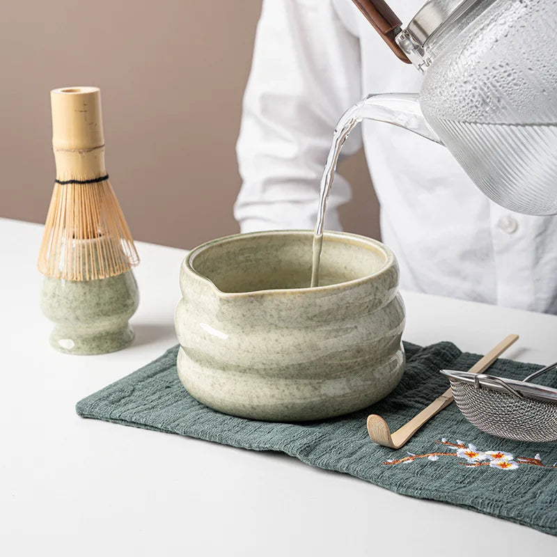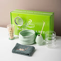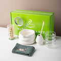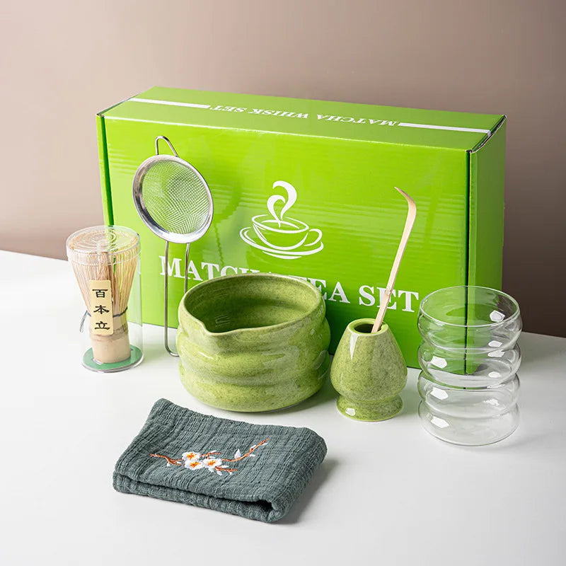 BespritGift Japanese Matcha Set 7pc Glass Cup Ceramic Bowl 100Prong Whisk Tea Scoop Ceremony Tools Complete Kit Gift Box