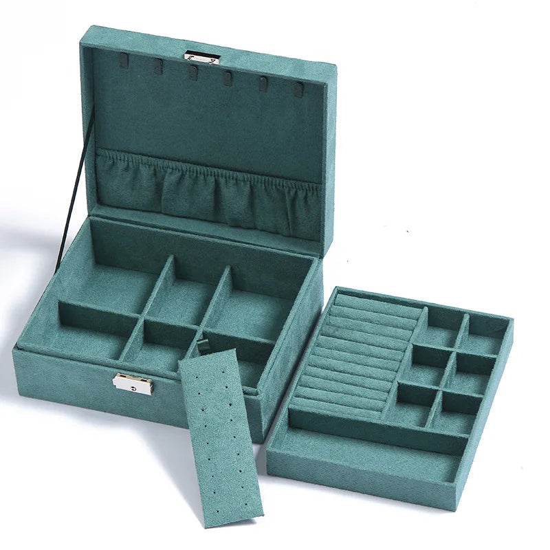 Keep your collection safe and beautifully organized with our Double-Layer Velvet Jewelry Box. Designed with spacious compartments, it offers the perfect storage solution for necklaces, rings, earrings, and bracelets.