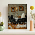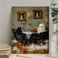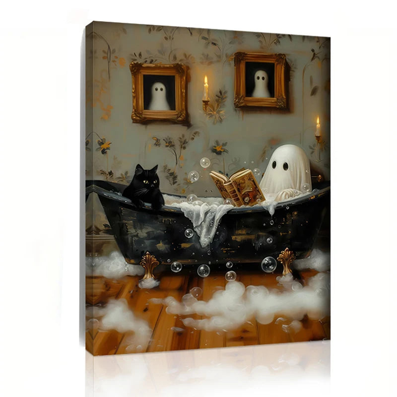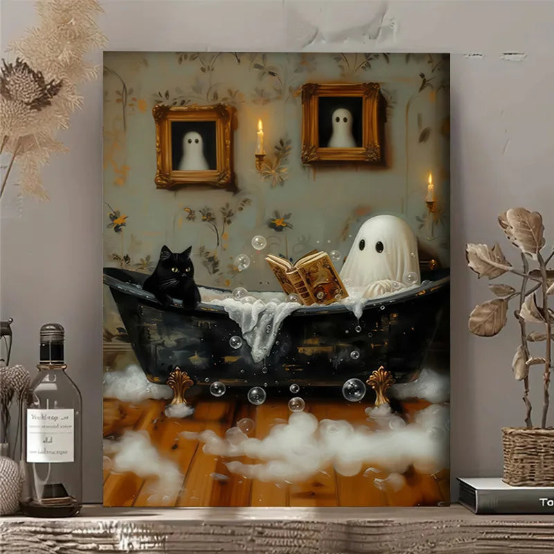 Framed Black Cat Ghost Reading Book in Bathtub Posters Spooky Halloween Decorative Canvas Painting Bathroom Wall Art Room Decor