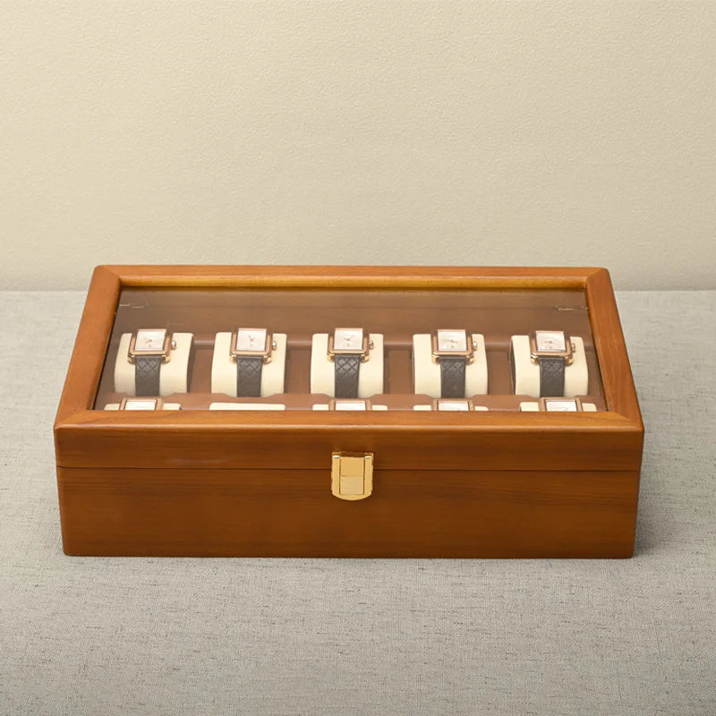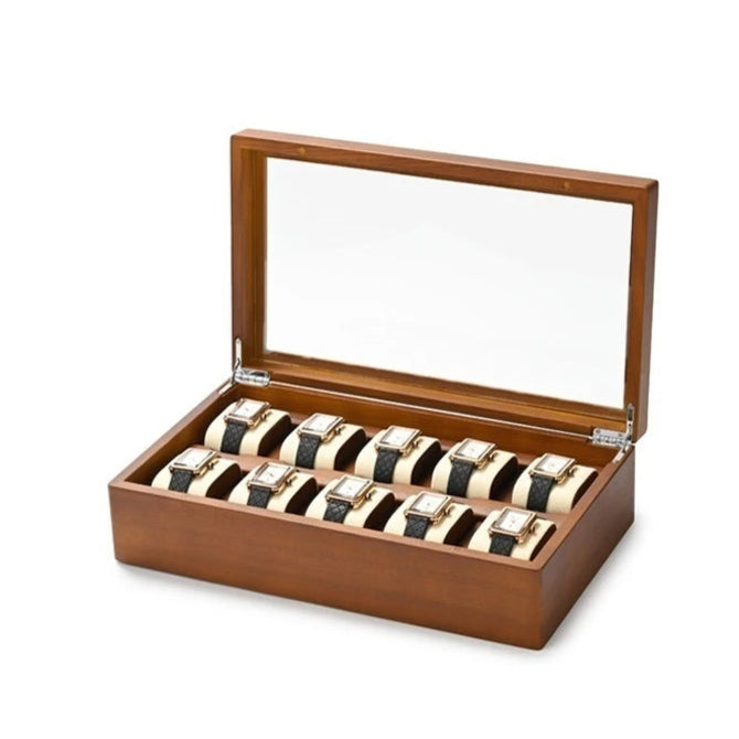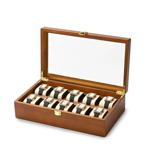 Wooden Watch Box Organizer – 10-Slot Solid Wood Jewelry Case with Glass Lid & Secure Lock | NaturalBuiltHome