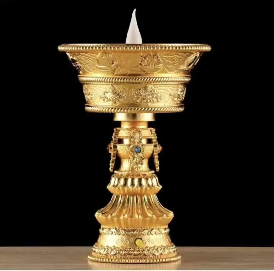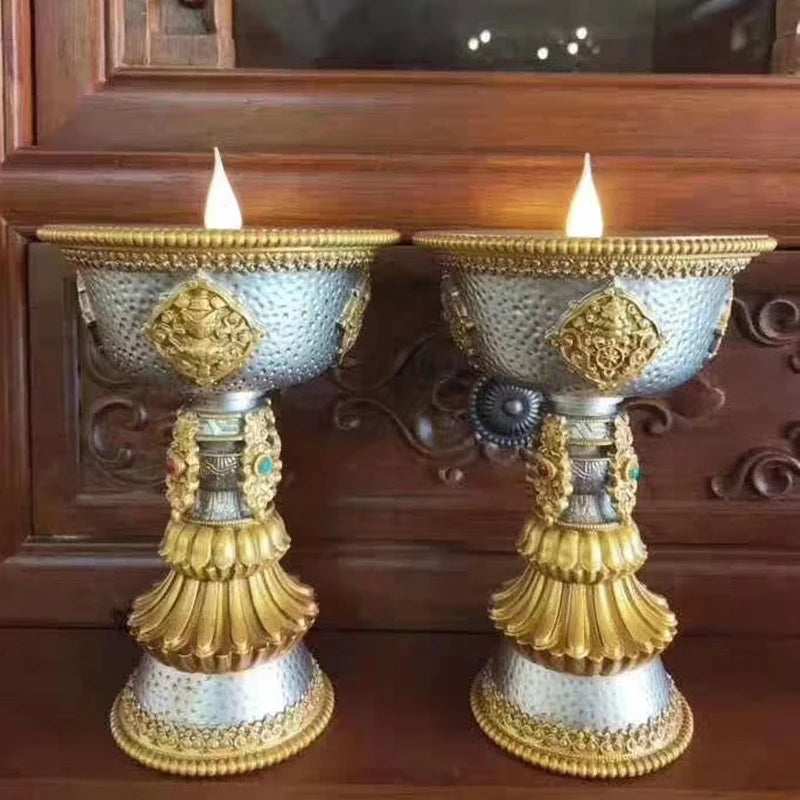 Resin Electric Thailand Butter Candle Lamp and Candlestick,Rechargeable Yellow LED, Buddhist Altar Lamp, Tibetan BaJiXiang Light
