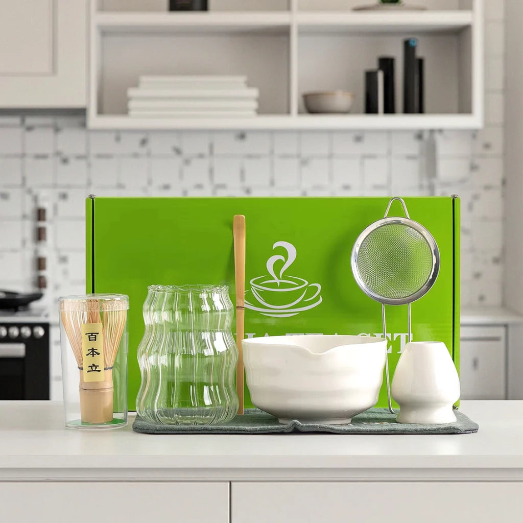 Tiki Hot Selling 7-Piece Matcha Kits Tea Set Glass Cup Ceramic Bowl Bamboo Whisk Stand Chasen Matcha Tea Gift Box for Home Use