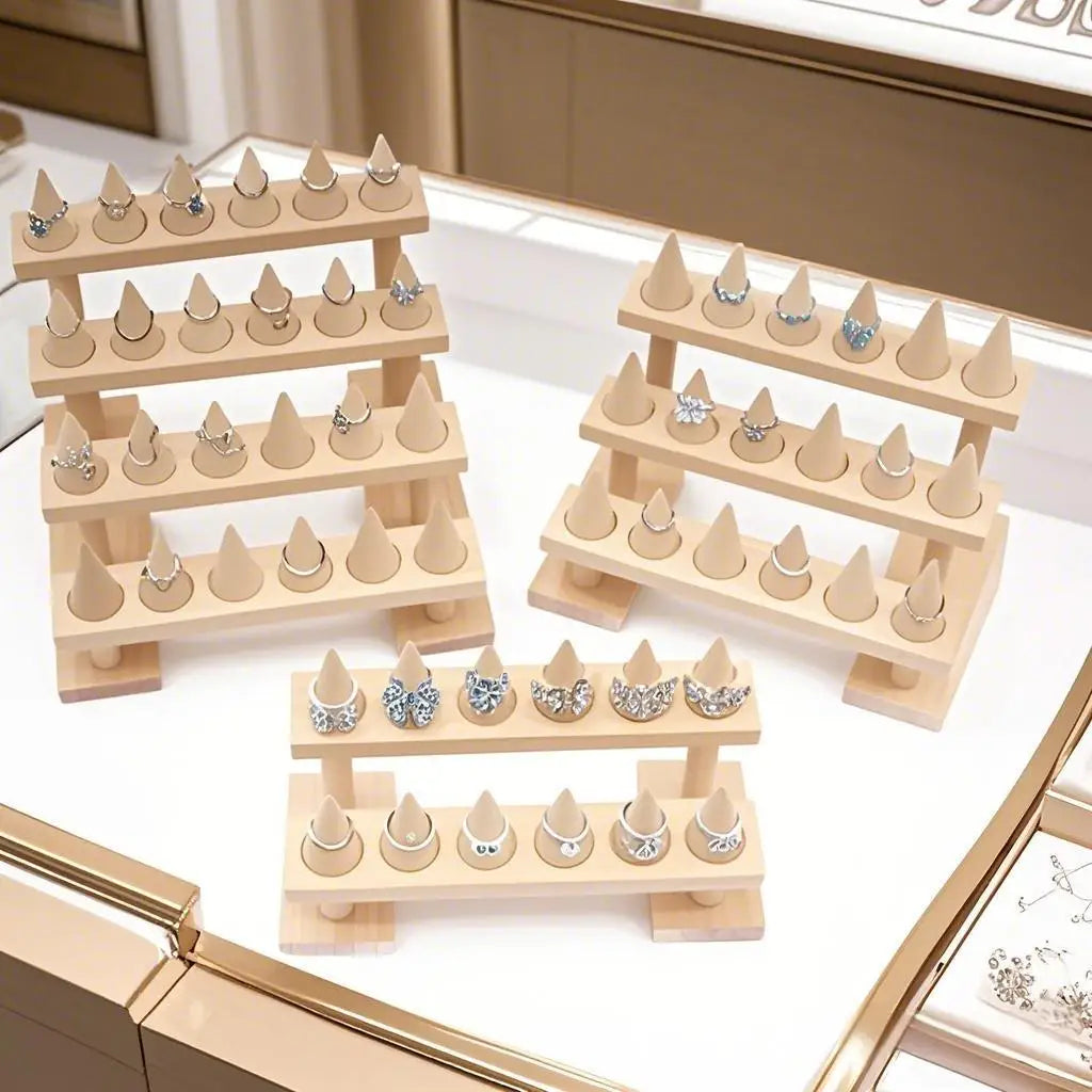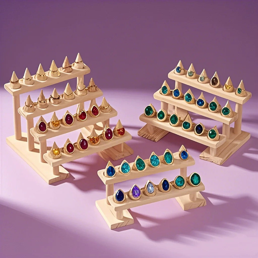 Highlight your jewelry with elegance thanks to our Wooden Ring Display Stand. Designed with cone-shaped holders, this rack allows you to store, organize, and present multiple rings in a stylish and practical way. Perfect for boutiques, exhibitions, and personal collections.